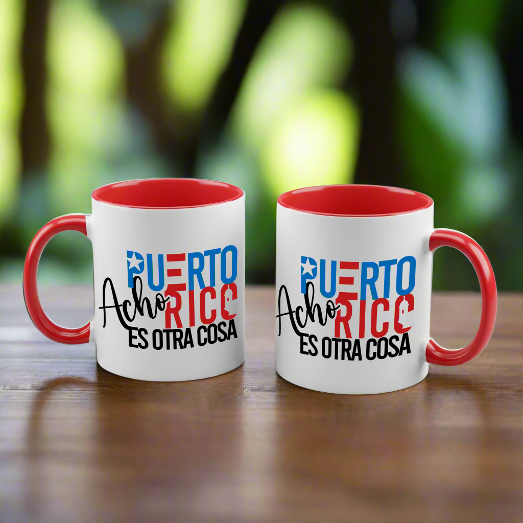Bold and Patriotic Design: This 11 oz. mug features a striking graphic design with the slogan "Acho Puerto Rico ES OTRA COSA" in a dynamic font. The vibrant red interior and handle perfectly complement the white exterior, while the text incorporates the iconic colors of the Puerto Rican flag, adding a touch of patriotic pride.